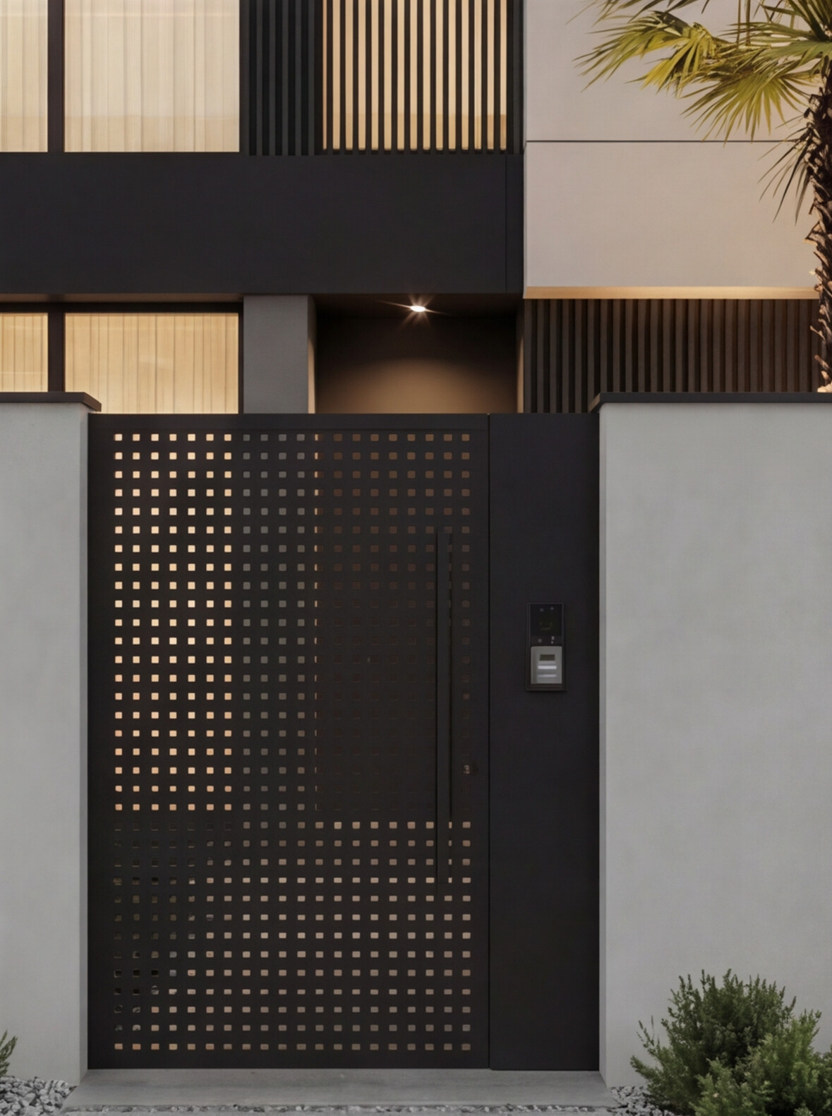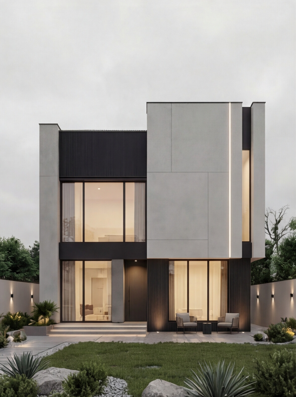 A contemporary villa defined by clean geometric volumes, refined material contrast, and elegant vertical lighting accents. Large glazed openings enhance natural light and indoor-outdoor connection, while the minimalist façade and landscaped elements create a balanced, modern living experience with a strong architectural identity.