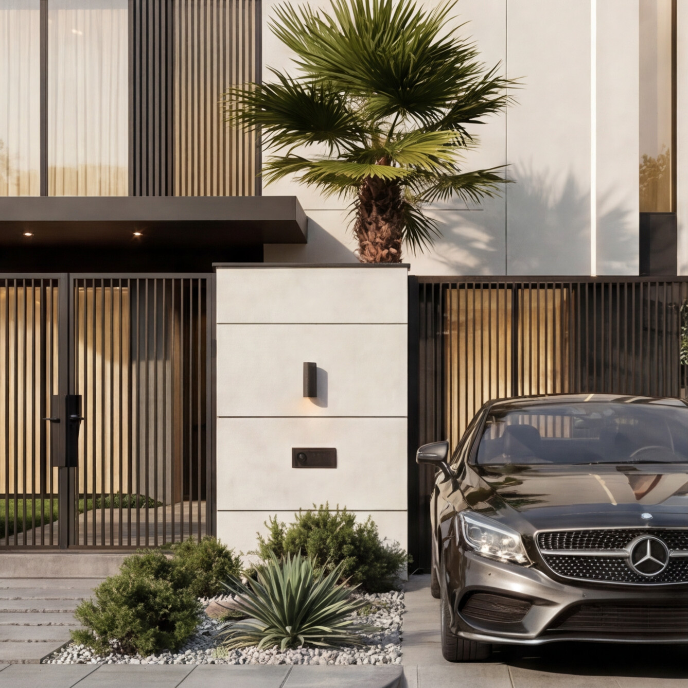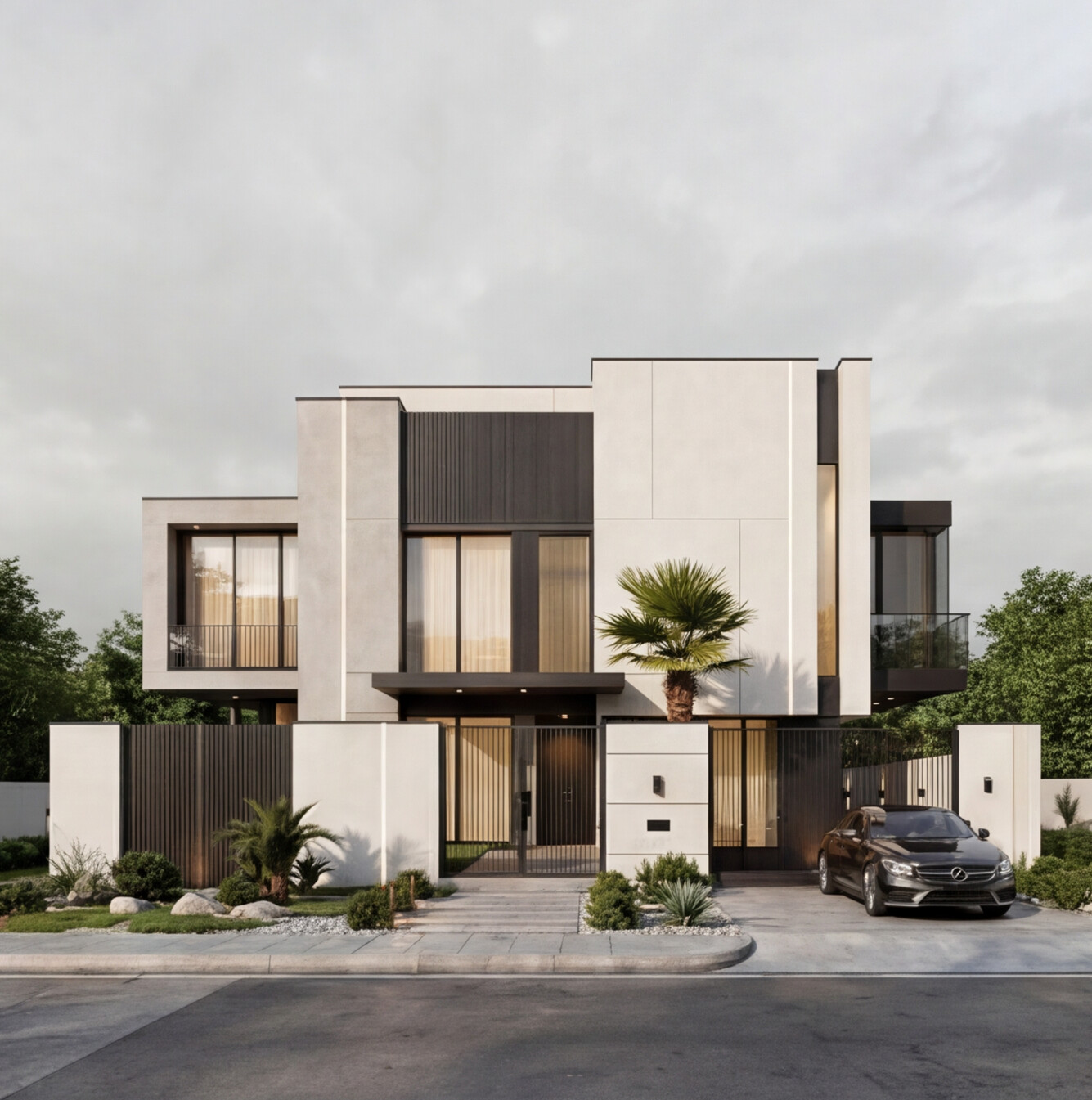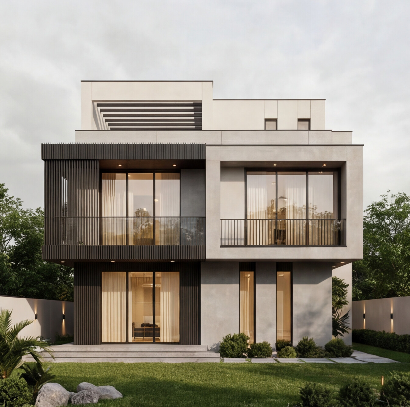 A contemporary villa defined by clean geometric volumes, refined material contrast, and elegant vertical lighting accents. Large glazed openings enhance natural light and indoor-outdoor connection, while the minimalist façade and landscaped elements create a balanced, modern living experience with a strong architectural identity.