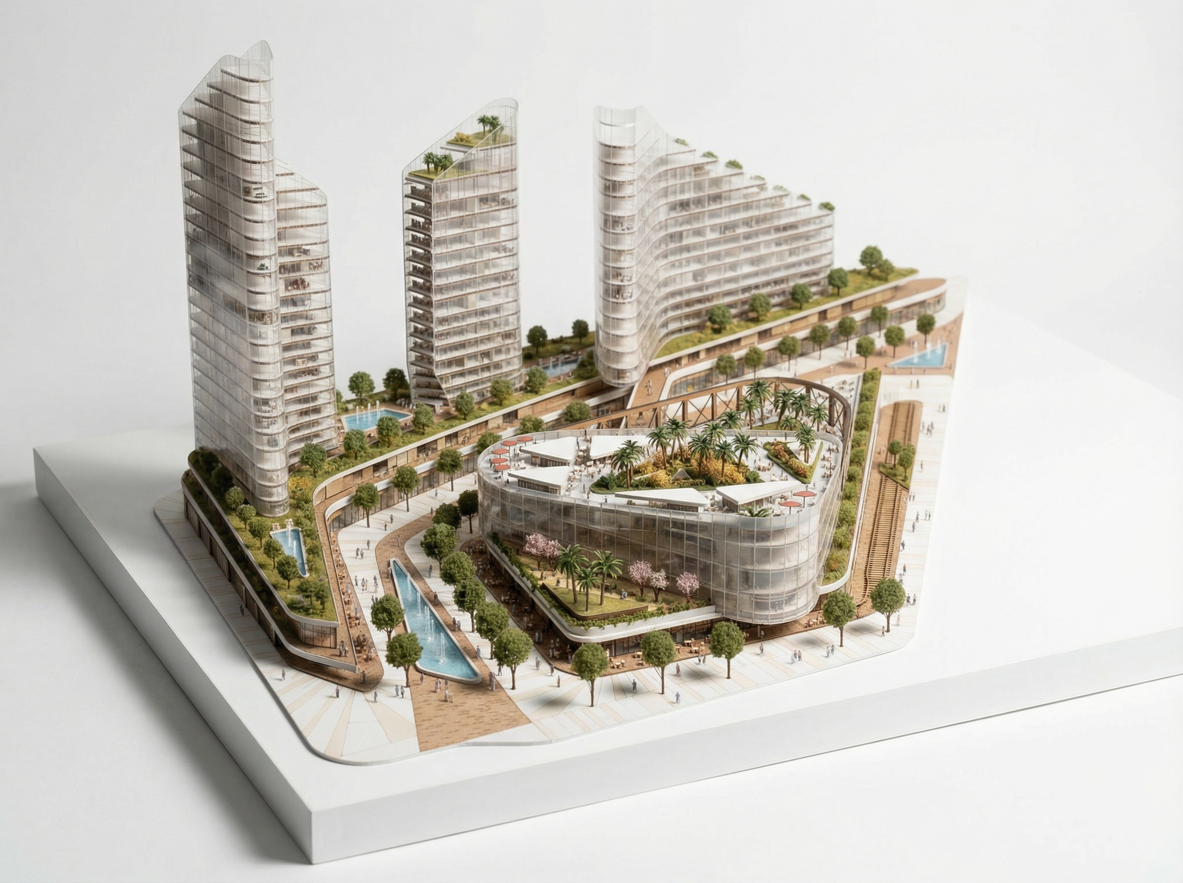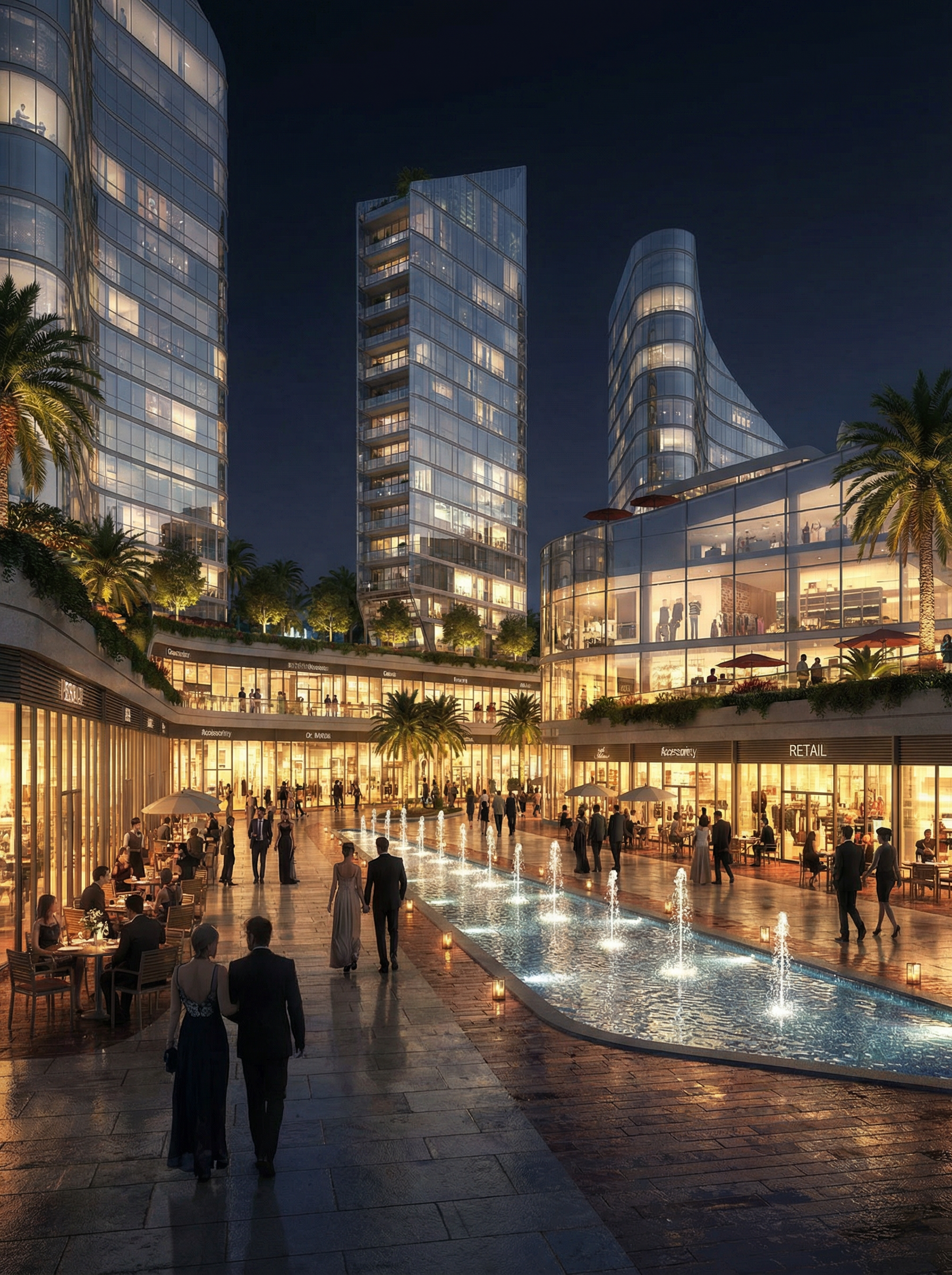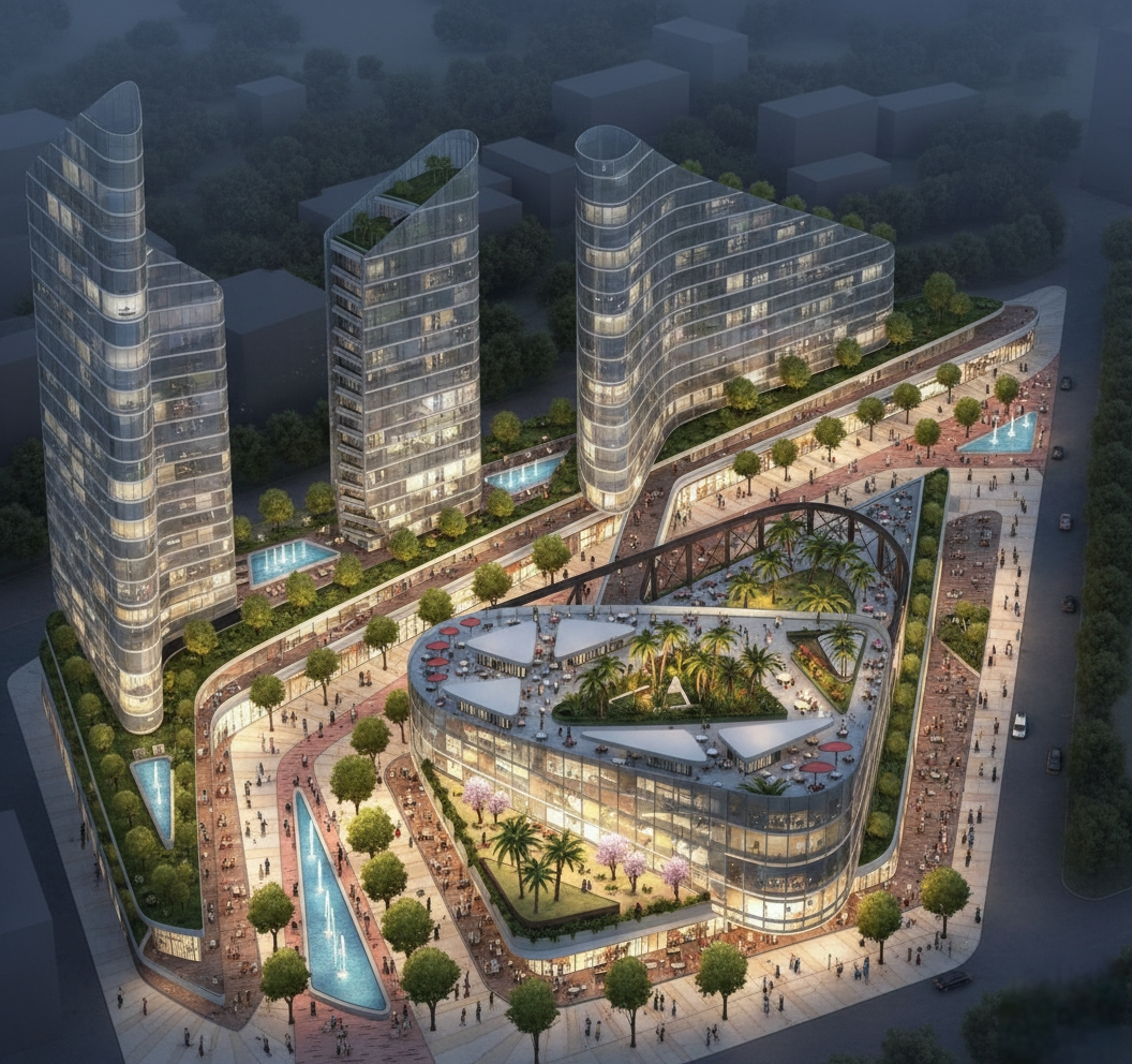 GDR Complex is a contemporary commercial, office, and hotel mixed-use development designed to create a dynamic urban destination. The project integrates retail spaces, modern office environments, and premium hospitality functions within a fluid architectural composition. The design features iconic curved forms, transparent glass façades, and a vibrant pedestrian spine enriched with landscaped areas and water features, enhancing user experience and connectivity. Thoughtfully planned layouts ensure functionality, natural daylight, and visual comfort across all components. GDR Complex represents a refined balance between business, commerce, and hospitality, redefining modern urban development.