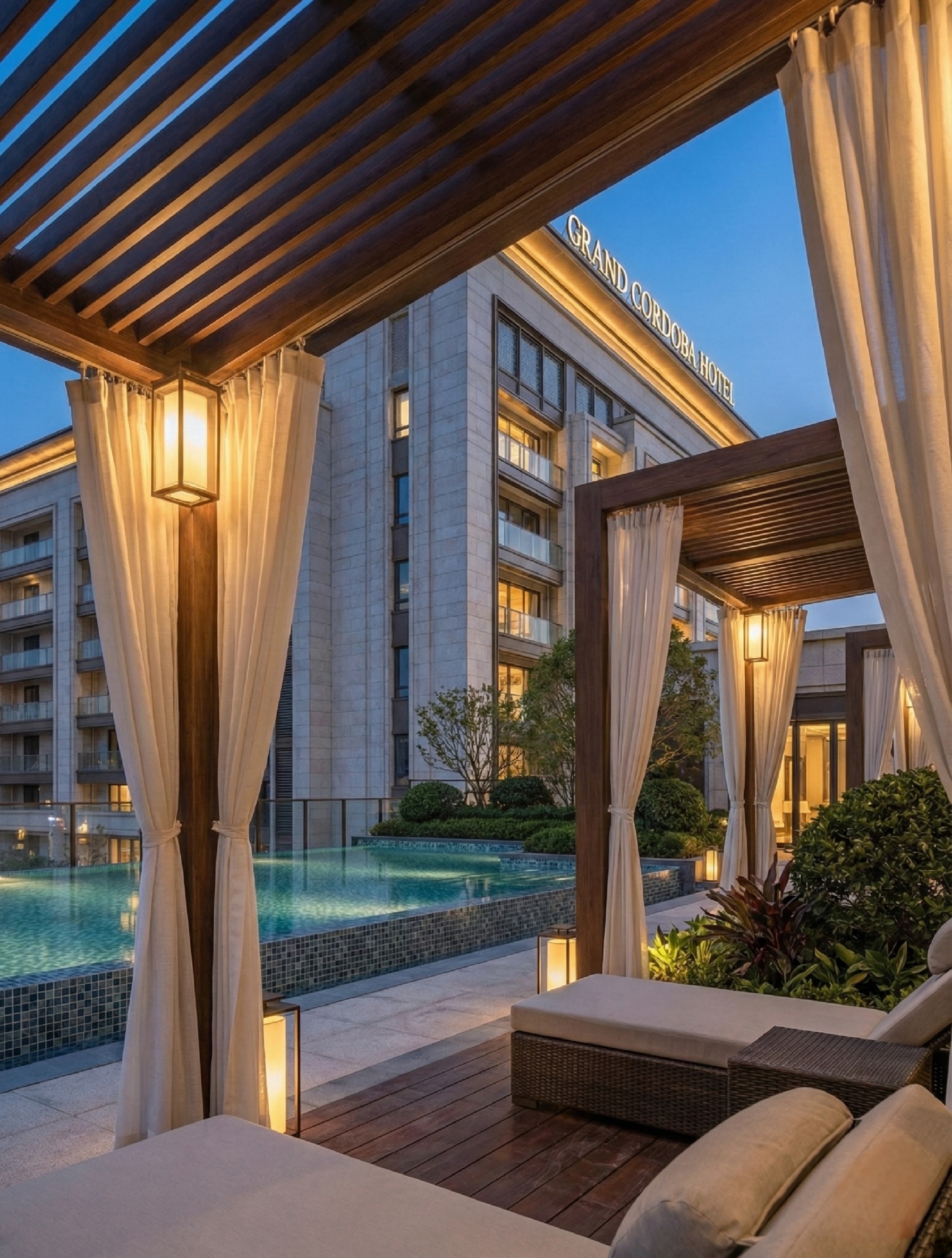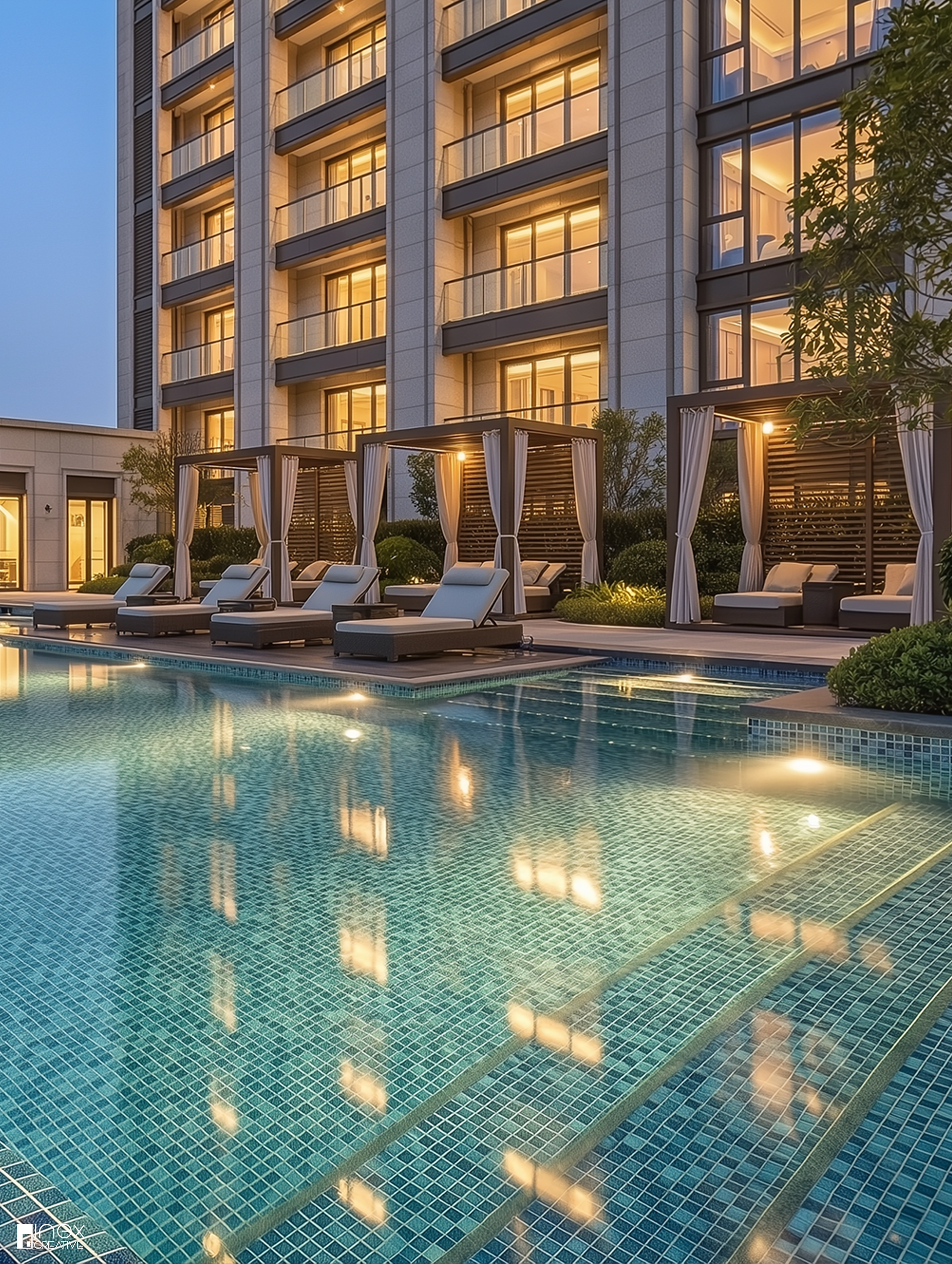 luxurious hotel project designed with unique architectural aesthetics and style, combining visual balance and elegance. It includes various hotel suites, VIP lounges, restaurants, indoor and outdoor pools, and commercial spaces in the city of Riyadh, Saudi Arabia.