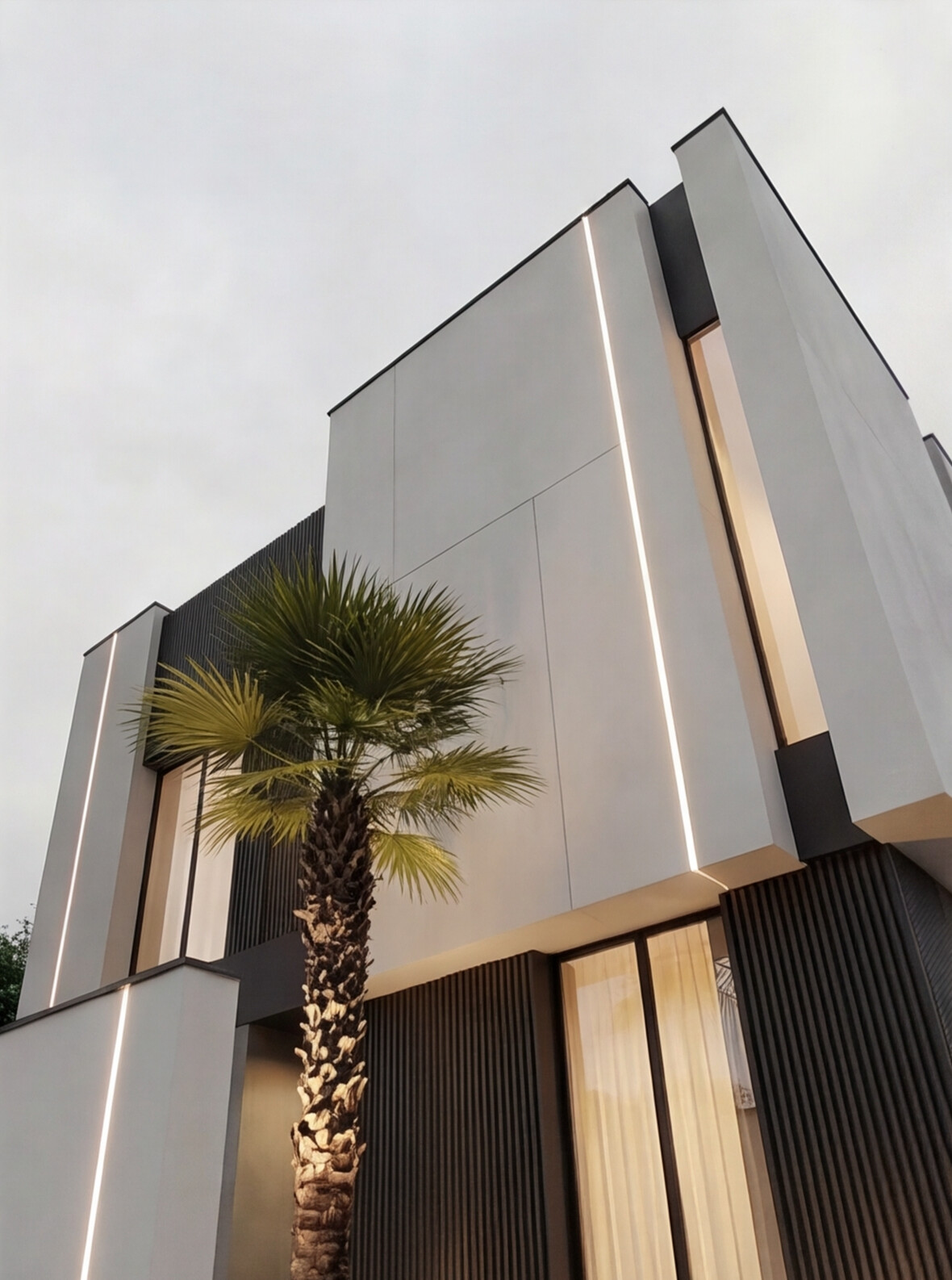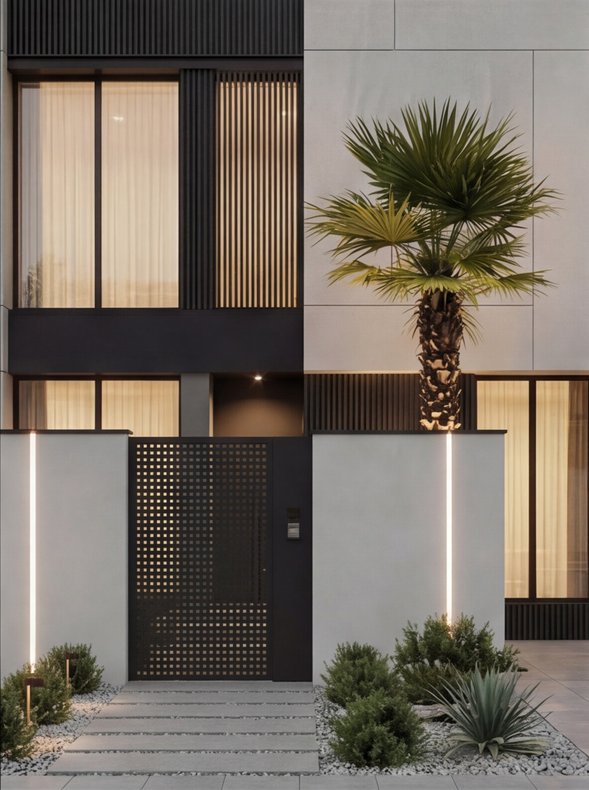 A contemporary villa defined by clean geometric volumes, refined material contrast, and elegant vertical lighting accents. Large glazed openings enhance natural light and indoor-outdoor connection, while the minimalist façade and landscaped elements create a balanced, modern living experience with a strong architectural identity.