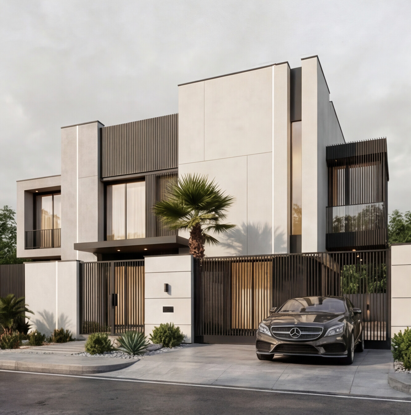 A contemporary villa defined by clean geometric volumes, refined material contrast, and elegant vertical lighting accents. Large glazed openings enhance natural light and indoor-outdoor connection, while the minimalist façade and landscaped elements create a balanced, modern living experience with a strong architectural identity.